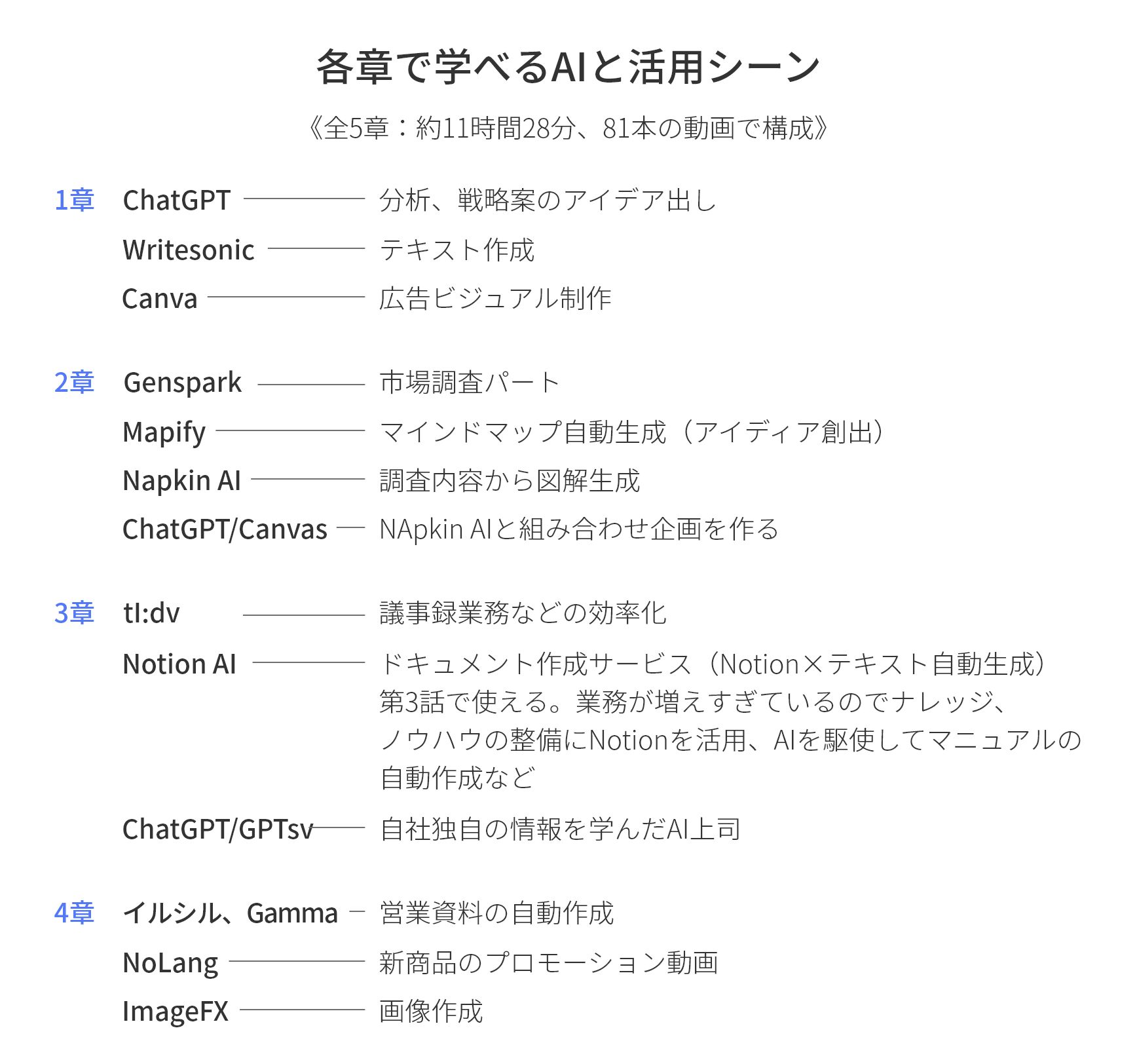企業の従業員一人ひとりが生成AIで、実現できることの全体像を把握できるだけでなく、画像や動画の生成技術を駆使した制作を可能にします。