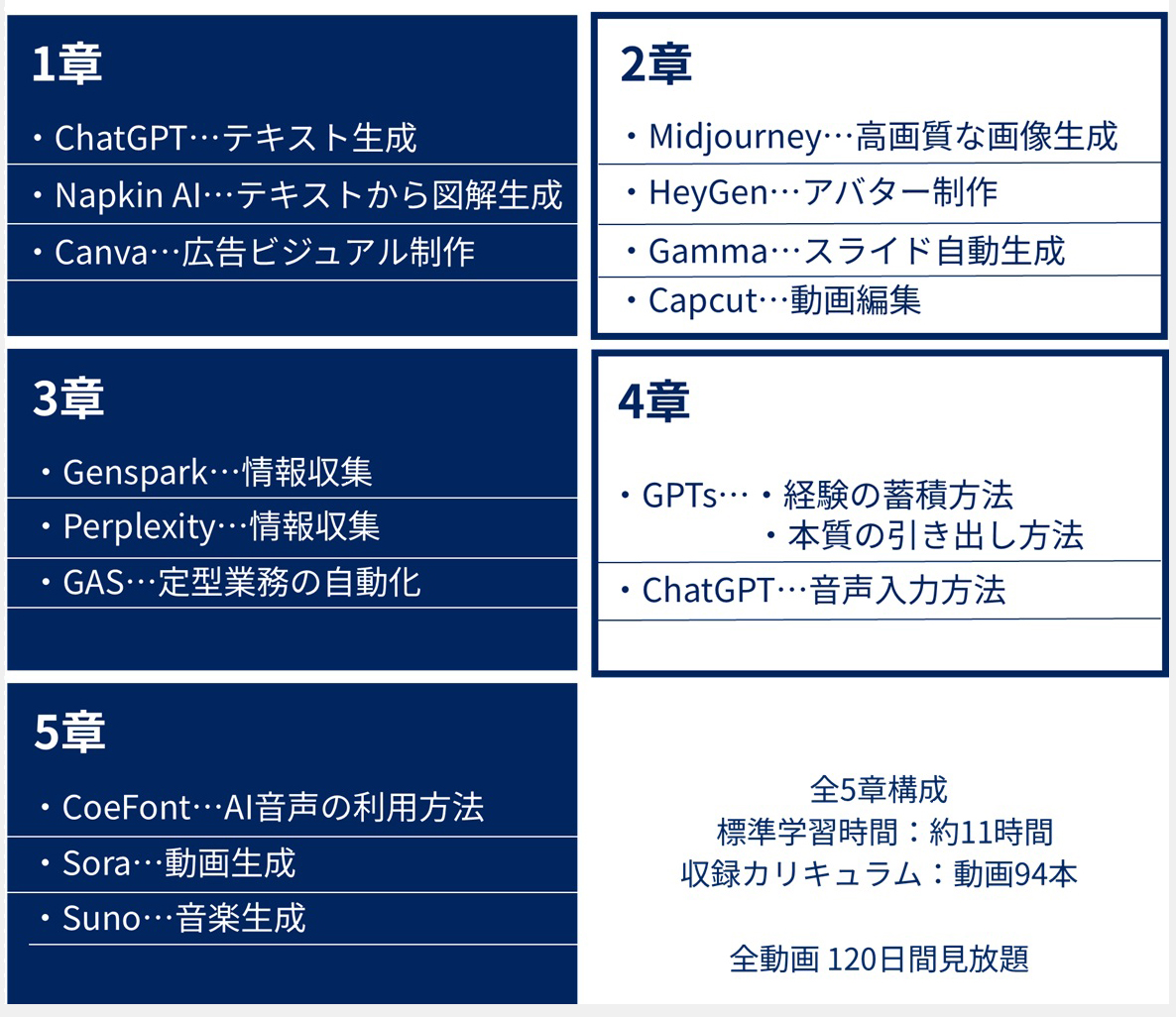 弊社の研修サービスは、ChatGPTなどのテキスト系生成AIの研修に留まらず、画像生成や動画生成、それらの素材を編集するためのAI技術をまなぶことができるカリキュラムです。